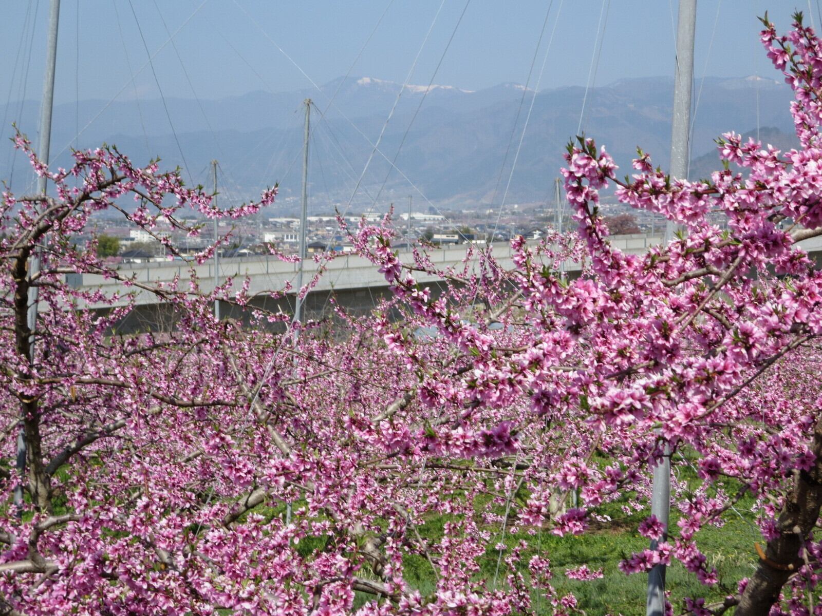 山梨県笛吹市にて撮影した桃の花畑とリニアの実験線です。